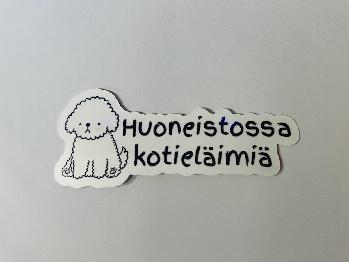 Söpö Huoneistossa kotieläimiä -tarra, jossa on valkoinen pörröinen Bichon Frise -koira. Tarran koko on noin 11 x 4,5 cm.