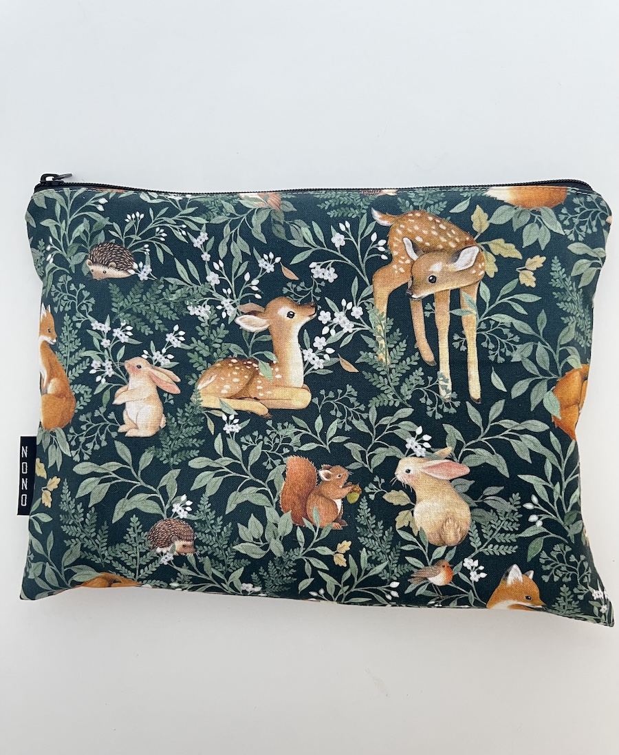 Vetoketjullinen säilytyspussukka metsän eläimet -kuosilla. Kuvion kohta saattaa hieman vaihdella pussukassa kuvaan nähden. Materiaali: puuvilla Koko: 24×18 cm